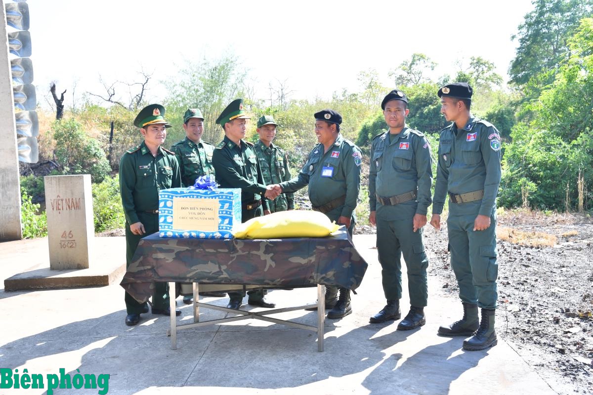 Nhân dịp Tết cổ truyền Chol Chnam Thmay, chiều 27/3, tại cột mốc biên giới số 46/16, Đồn Biên phòng Yok Đôn, Ban Chỉ huy Bộ đội Biên phòng tỉnh Đắk Lắk tổ chức gặp mặt, tặng quà Đồn Cảnh sát bảo vệ biên giới bộ Cobaldomray, thuộc Ty Công an tỉnh Mondulkiri, Vương quốc Campuchia. Ảnh: Ngọc Lân