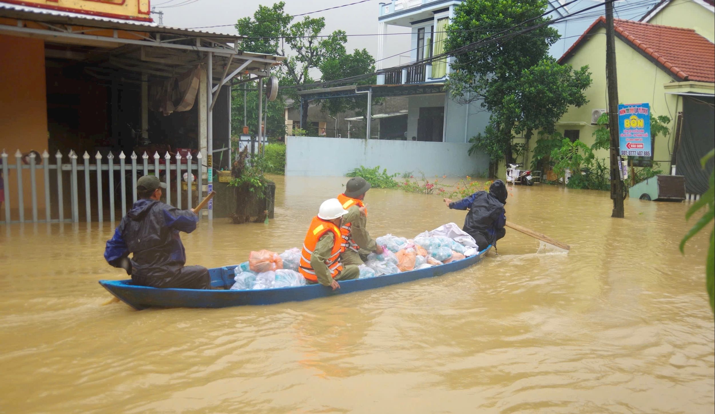 Mực nước ngập có nơi hơn 3 mét, dòng chảy xiết khiến công tác tiếp cận người dân gặp nhiều khó khăn. Lực lượng cứu trợ đã phải dùng thuyền nhỏ để trung chuyển hàng hóa, sau đó bàn giao cho tổ trưởng tổ dân phố tiếp tục đưa đến từng hộ gia đình ở khu vực trọng điểm, đảm bảo không ai bị thiếu đói, rét mướt.