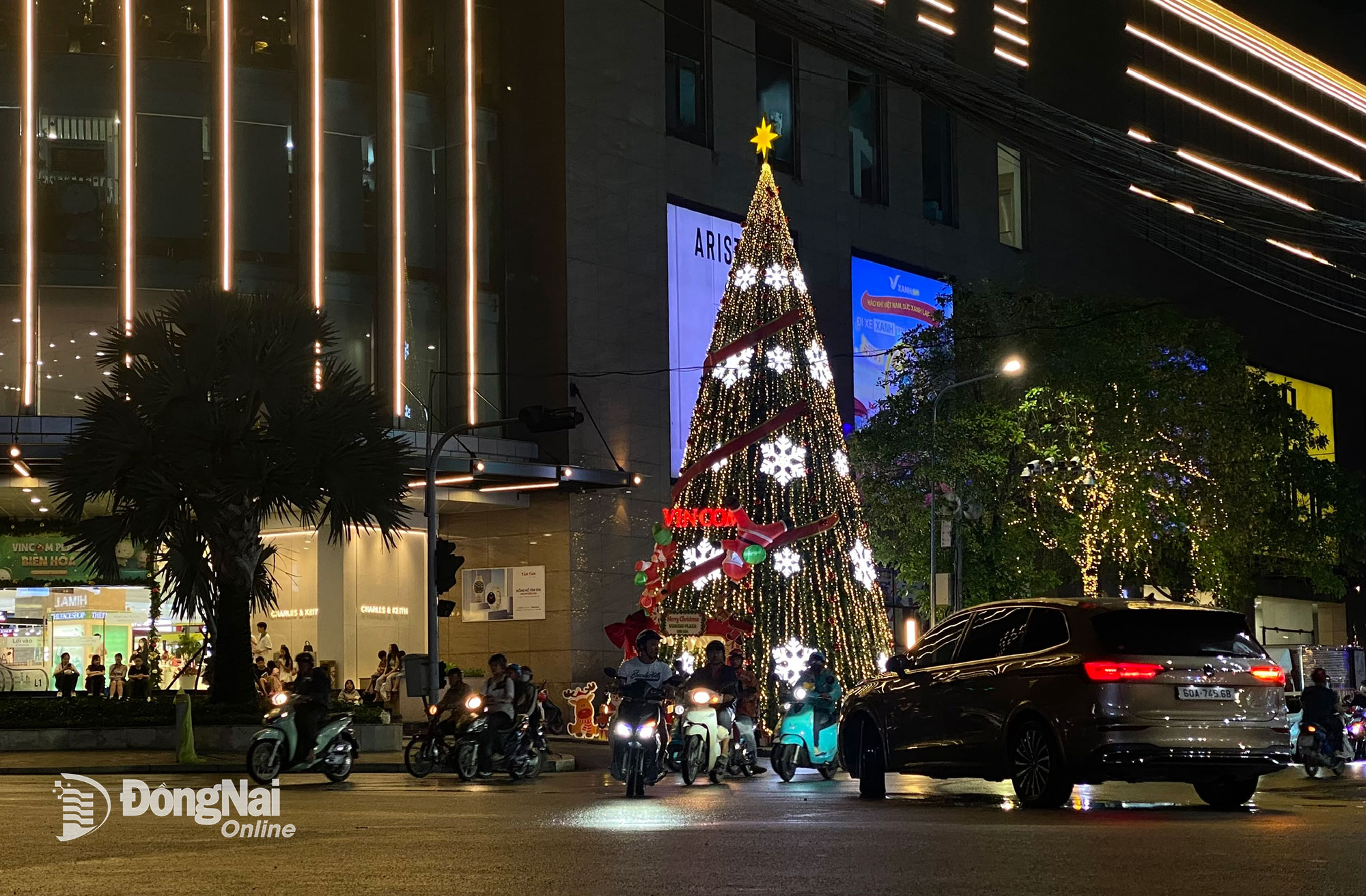 Cây thông Giáng sinh làm sáng bừng cả một góc phố. Ảnh: Thủy Tiên
