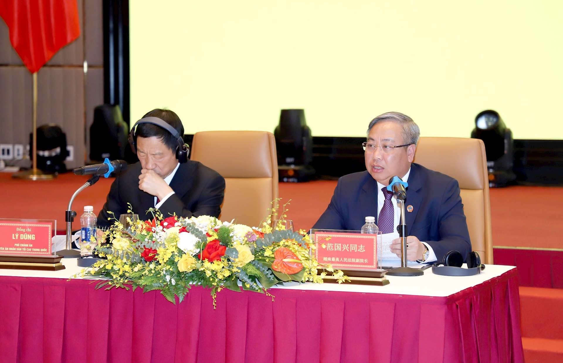 Đồng chí Phạm Quốc Hưng, Phó Chánh án Tòa án nhân dân tối cao Việt Nam và đồng chí Lý Dũng, Phó Chánh án Tòa án nhân dân tối cao Trung Quốc điều hành phần thảo luận.