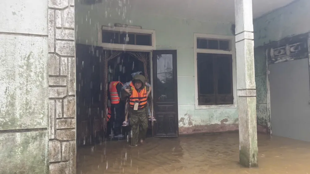 Công an xã Hưng Lộc hỗ trợ sơ tán người già, trẻ em ra khỏi vùng ngập lụt.