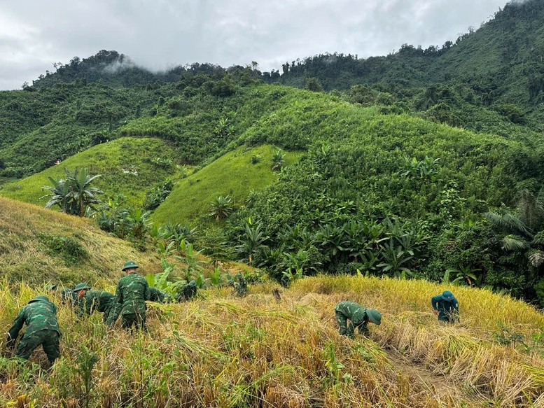 Với phương châm "xanh nhà hơn già đồng", lực lượng biên phòng tích cực giúp người dân miền núi gặt lúa nhằm giảm thiệt hại trước cơn bão số 13 - Ảnh: Bộ đội Biên phòng