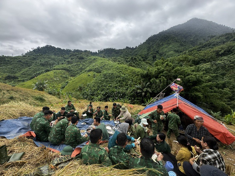 Bộ đội cùng bà con quây quần bên mâm cơm trưa ở lưng đồi - Ảnh: Bộ đội Biên phòng