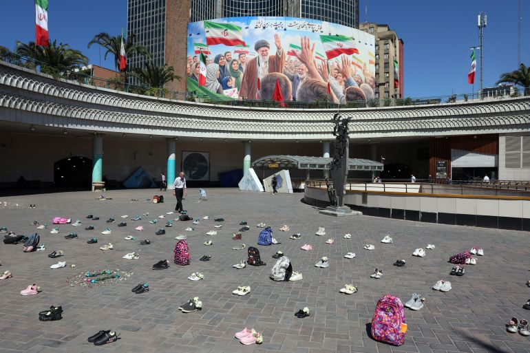 Người dân Iran đi bộ trước một tấm áp phích khổng lồ về cố Lãnh tụ Tối cao Ayatollah Ali Khamenei. Bên cạnh đó là những vật dụng mang tính biểu tượng của các nữ sinh một trường tiểu học ở TP Minab (tỉnh Hormozgan, miền nam Iran) thiệt mạng hồi đầu xung đột, được đặt trên mặt đất tại Quảng trường Valiasr ở Tehran. Ảnh: Abedin Taherkenareh/EPA