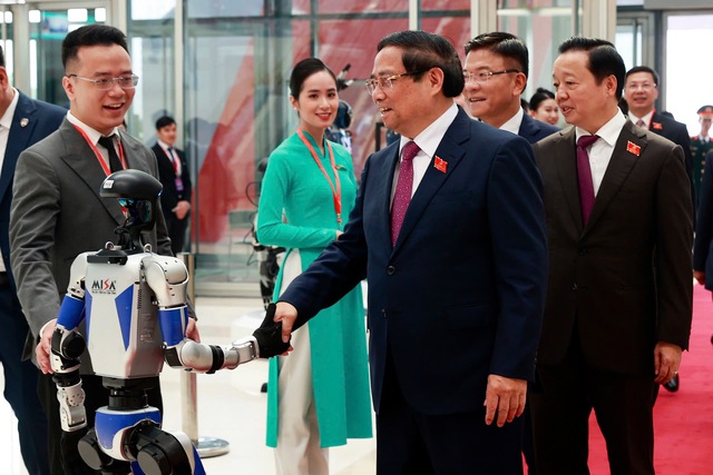 Thủ tướng Phạm Minh Chính và các đại biểu trải nghiệm một số sản phẩm được trưng bày tại triển lãm nhân dịp Đại hội - Ảnh: VGP/Nhật Bắc