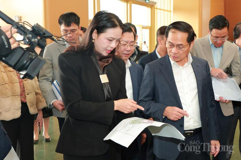 Phó Thủ tướng lắng nghe đại diện Trung tâm Hội chợ Triển lãm Quốc gia (VEC) trình bày vị trí các khu vực trong Hội chợ Mùa Xuân 2026.