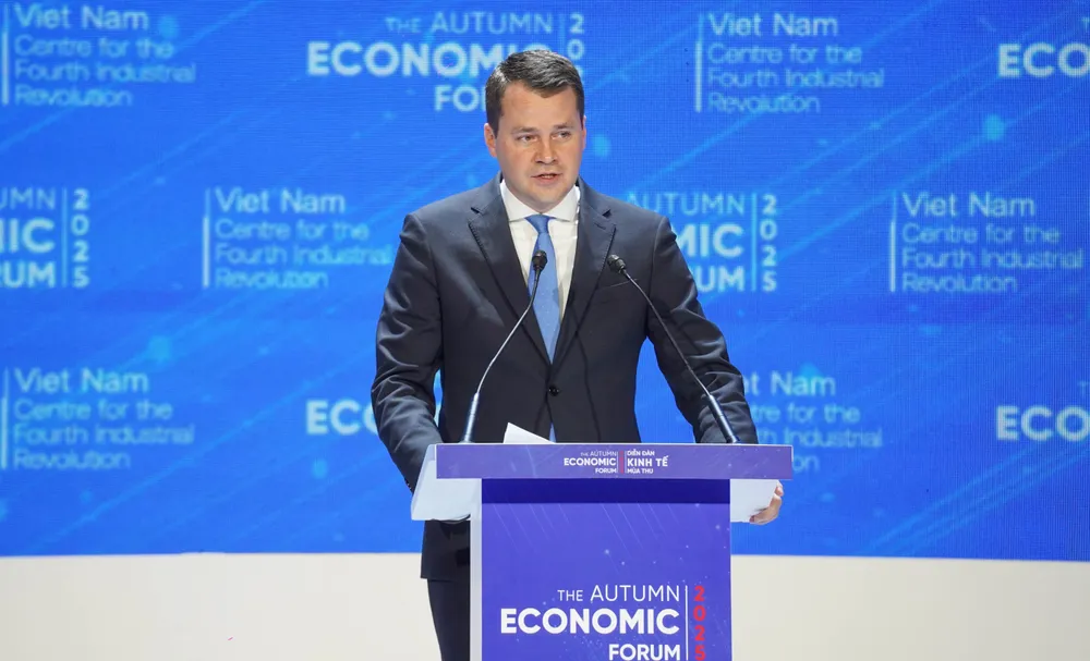 Bà Pauline Tamesis, Điều phối viên thường trú của Liên Hợp Quốc tại Việt Nam tham gia báo cáo tại Diễn đàn Kinh tế mùa thu năm 2025 về chủ đề "Chuyển đổi xanh trong kỷ nguyên số".
