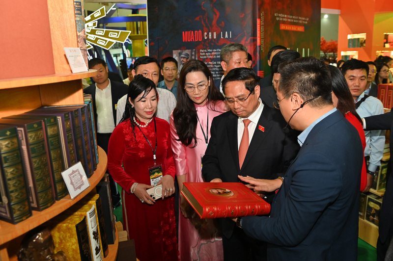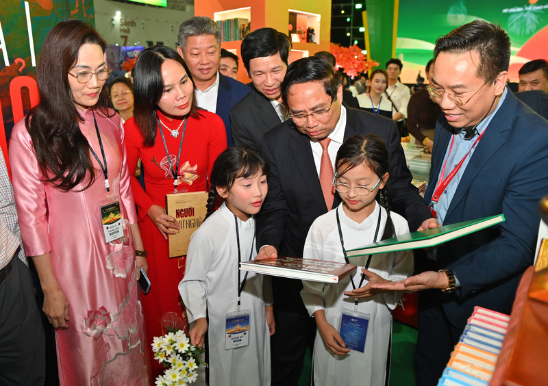 Thủ tướng tham quan không gian sách tại hội chợ.