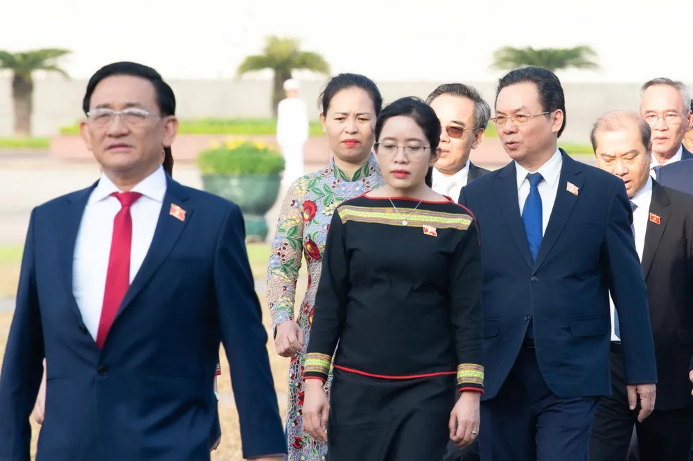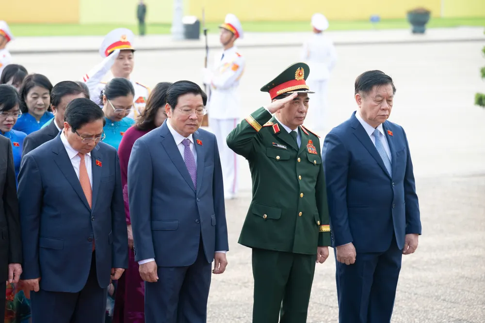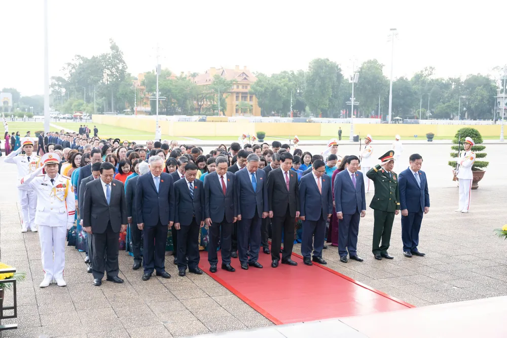 Tổng Bí thư Tô Lâm, Chủ tịch nước Lương Cường, Thủ tướng Phạm Minh Chính, Chủ tịch Quốc hội Trần Thanh Mẫn cùng các đại biểu Quốc hội đặt vòng hoa và vào Lăng viếng Chủ tịch Hồ Chí Minh. Ảnh: QH