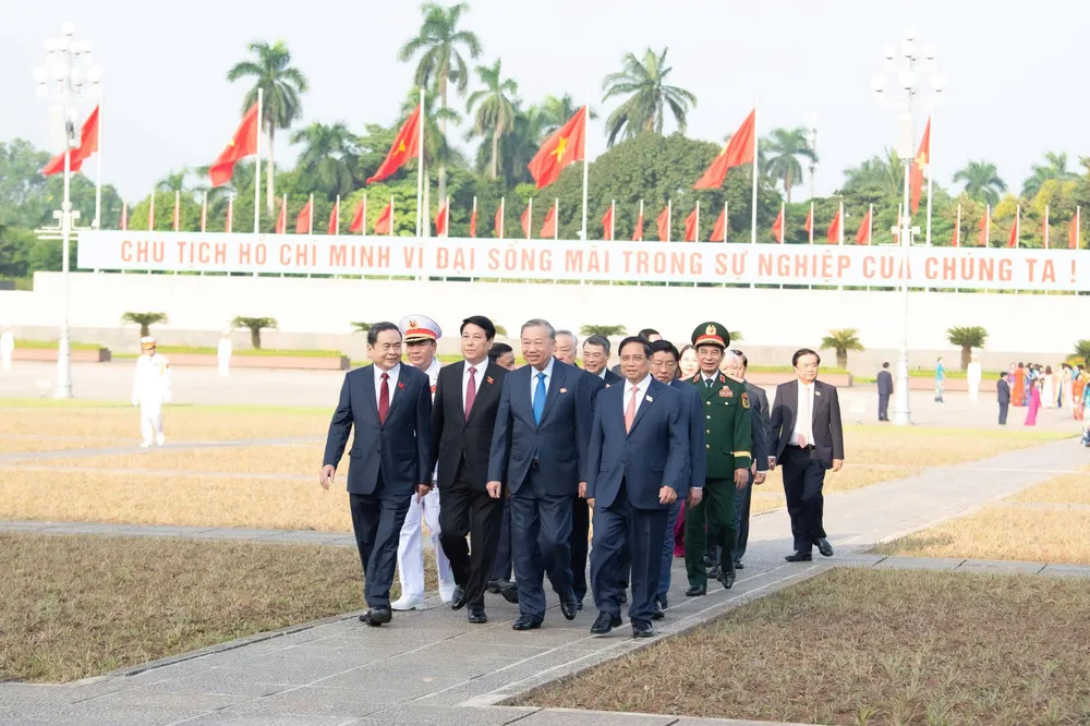 Tổng Bí thư Tô Lâm, Chủ tịch nước Lương Cường, Thủ tướng Phạm Minh Chính, Chủ tịch Quốc hội Trần Thanh Mẫn, Thường trực Ban Bí thư Trần Cẩm Tú cùng các đại biểu vào Lăng viếng Chủ tịch Hồ Chí Minh. Ảnh: QH