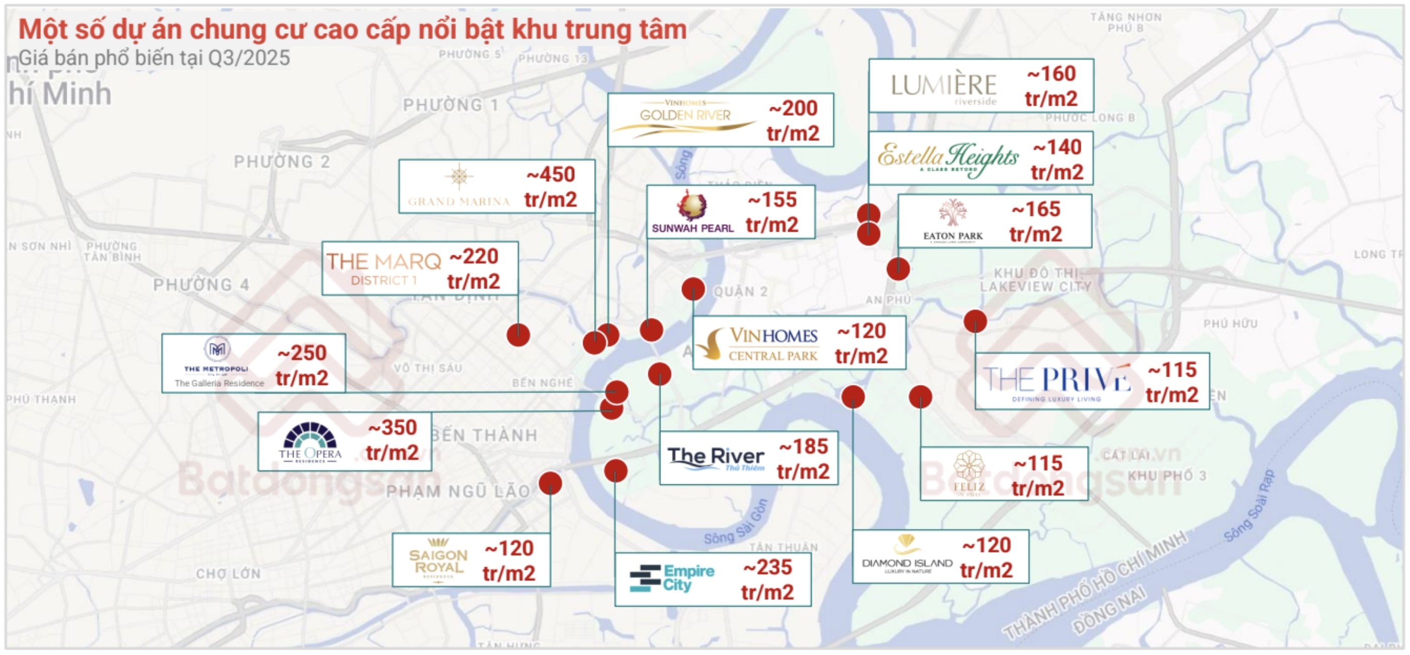 Đáng chú ý, tại trung tâm truyền thống của TP.HCM và phần trung tâm mở rộng như Thủ Thiêm hiện giá chung cư đã vượt mốc 300 triệu đồng/m2. Trong đó nổi bật là dự án The Opera Residence của SonKim Land (phường An Khánh) với giá trung bình 350 triệu đồng/m2, hay thậm chí chạm mức 450 triệu đồng/m2 là tổ hợp dự án Grand Marina Saigon của Masterise Homes (phường Sài Gòn), theo Batdongsan.com.vn.