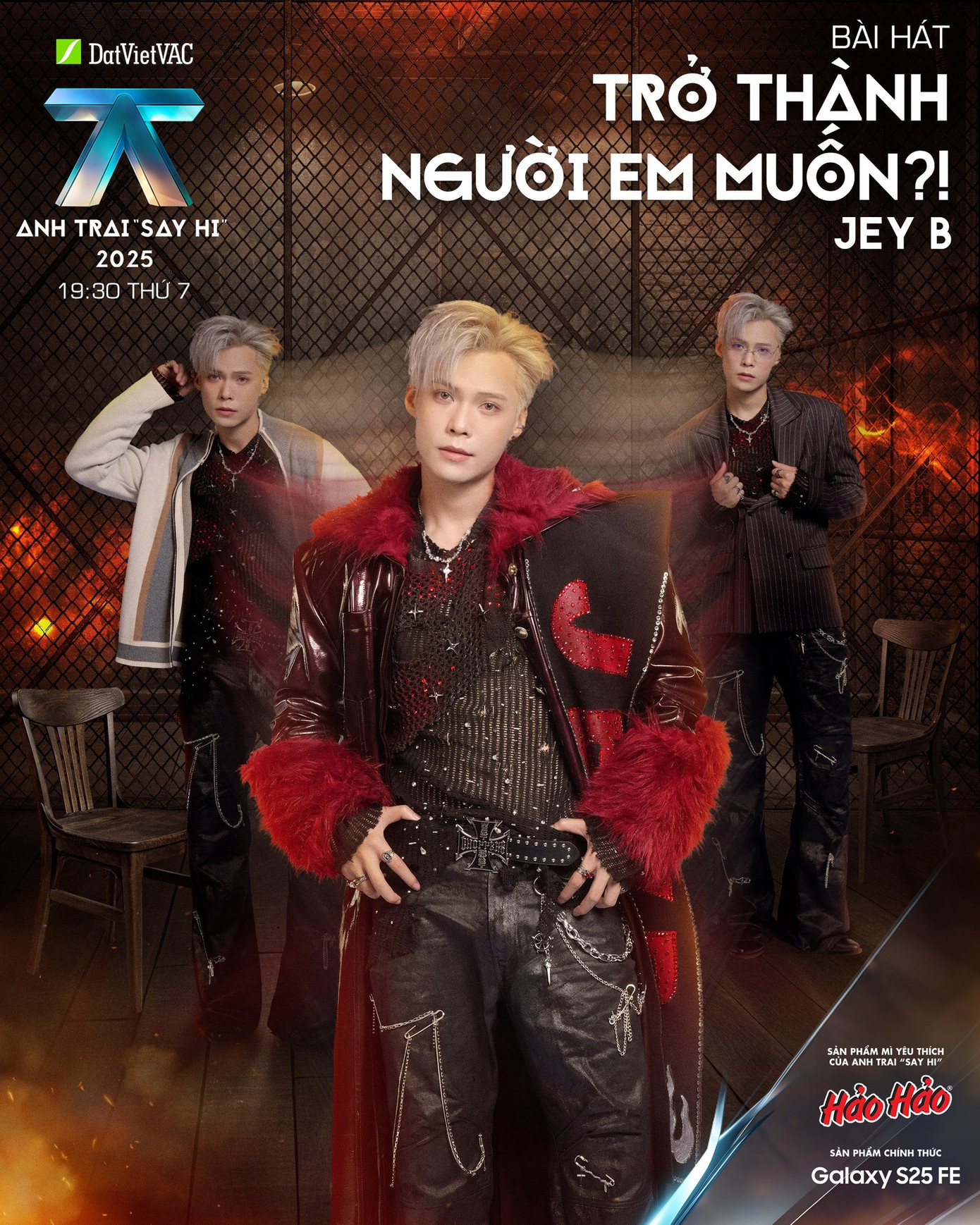 Jey B bảnh bao trong các thiết kế tông đen chủ đạo, nhấn nhá sắc đỏ cho sân khấu Trở Thành Người Em Muốn.