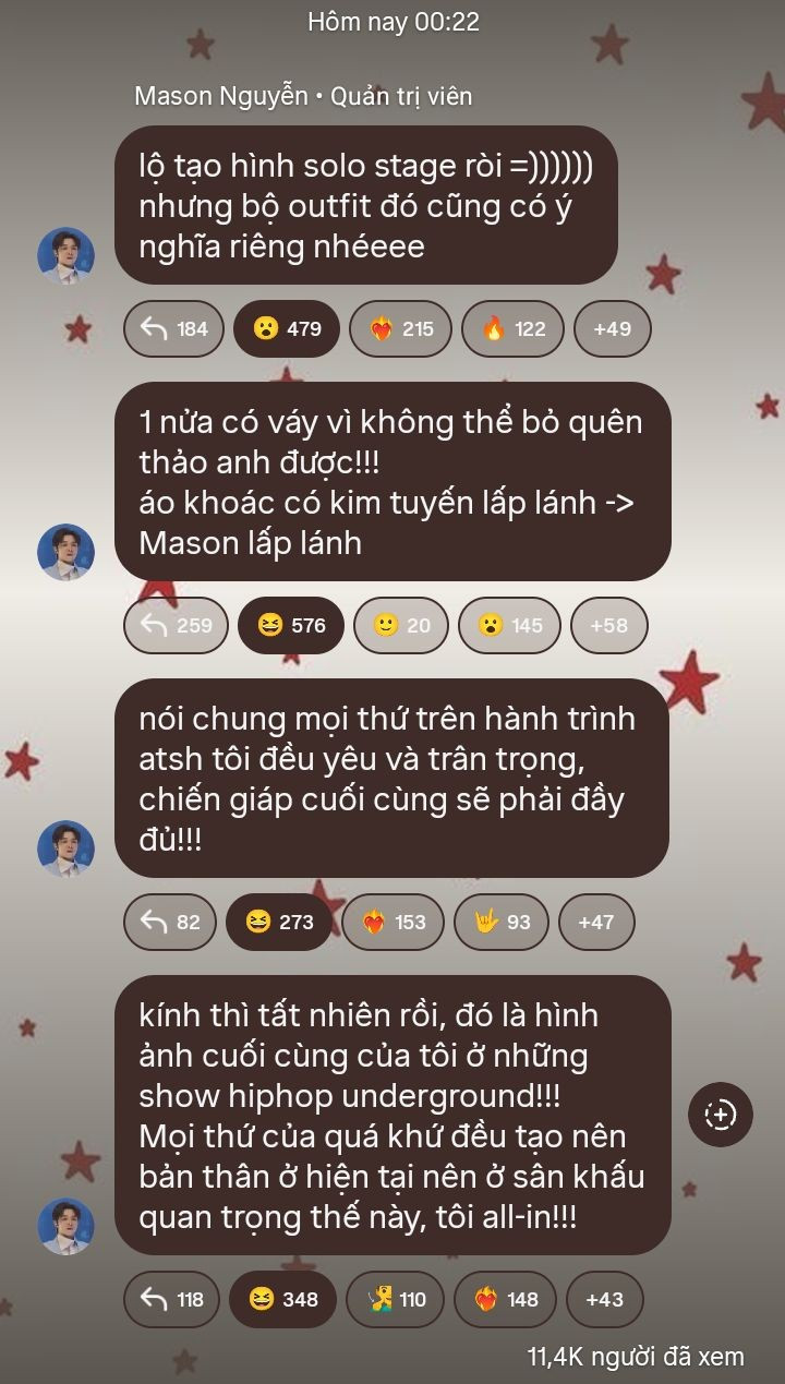 Sắc vóc Mason Nguyễn thăng hạng, trở nên thon gọn đáng kể sau 5 . Nam rapper trình diễn tiết mục solo Bí Mật Nhỏ, tạo ra bố cục "đầu cuối tương ứng" cho hành trình. "Anh Trai" lựa chọn trang phục gam đỏ đen - màu chủ đạo của sân khấu Hermosa (Live stage 1), với chất liệu tweed, kim sa lấp lánh.