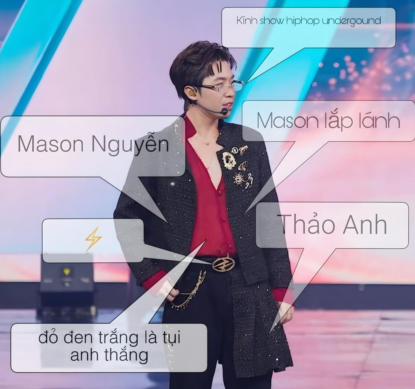 Qua , Mason cho biết "bộ cánh" gửi gắm nhiều ý nghĩa đặc biệt. Phần giả váy ngang hông ẩn ý về nhân cách “bánh bèo” mang tên Thảo Anh được khơi dậy từ gameshow. Trong khi đó, anh tri ân quá khứ qua chiếc kính - món phụ kiện gắn liền với nam rapper ở những show Hip-Hop underground cuối cùng trước khi lên mainstream.