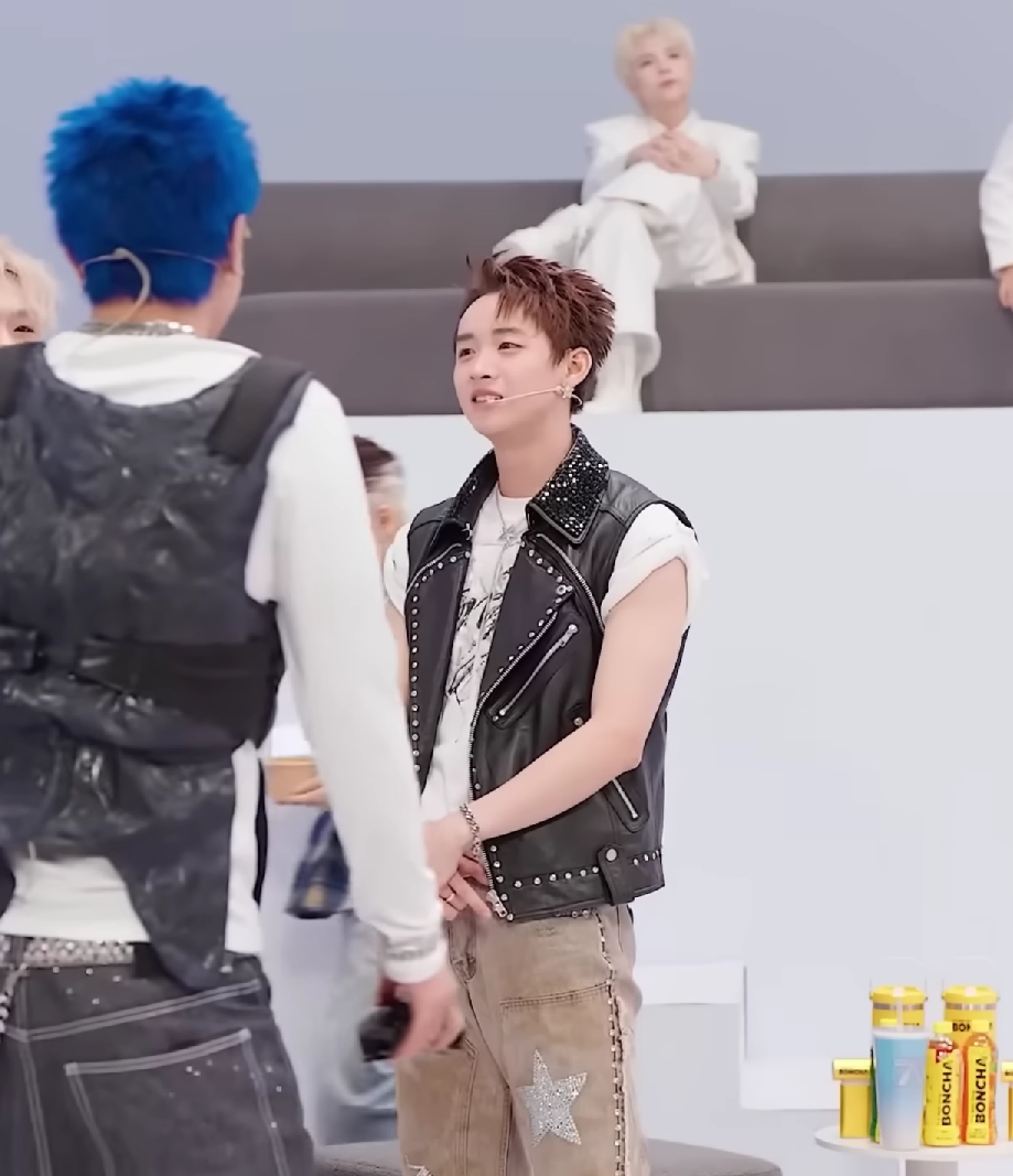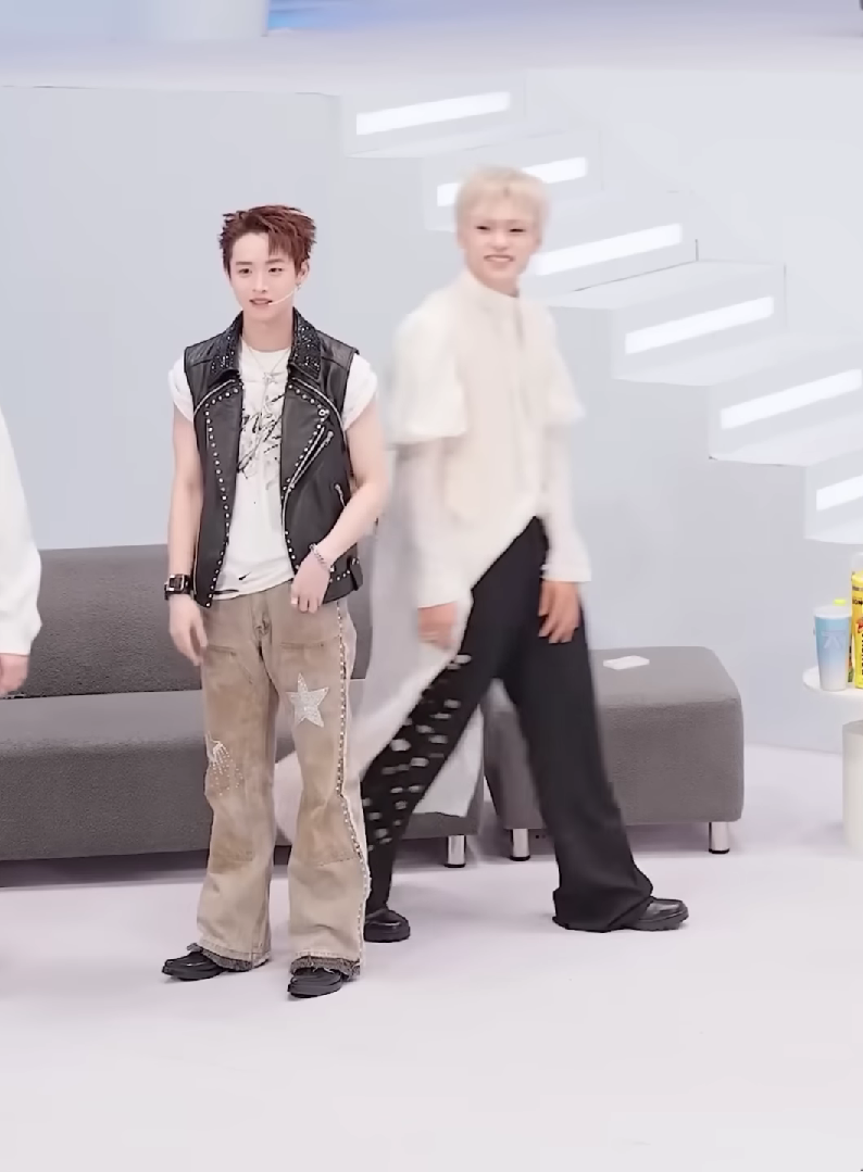 diện trang phục mang hơi hướng Y2K, Pop-Punk với áo khoác gile da màu đen bên ngoài áo thun trắng, phối quần jeans có hiệu ứng loang. Outfit tôn lên tỷ lệ cơ thể "siêu thực" của cựu thực tập sinh idol K-Pop.