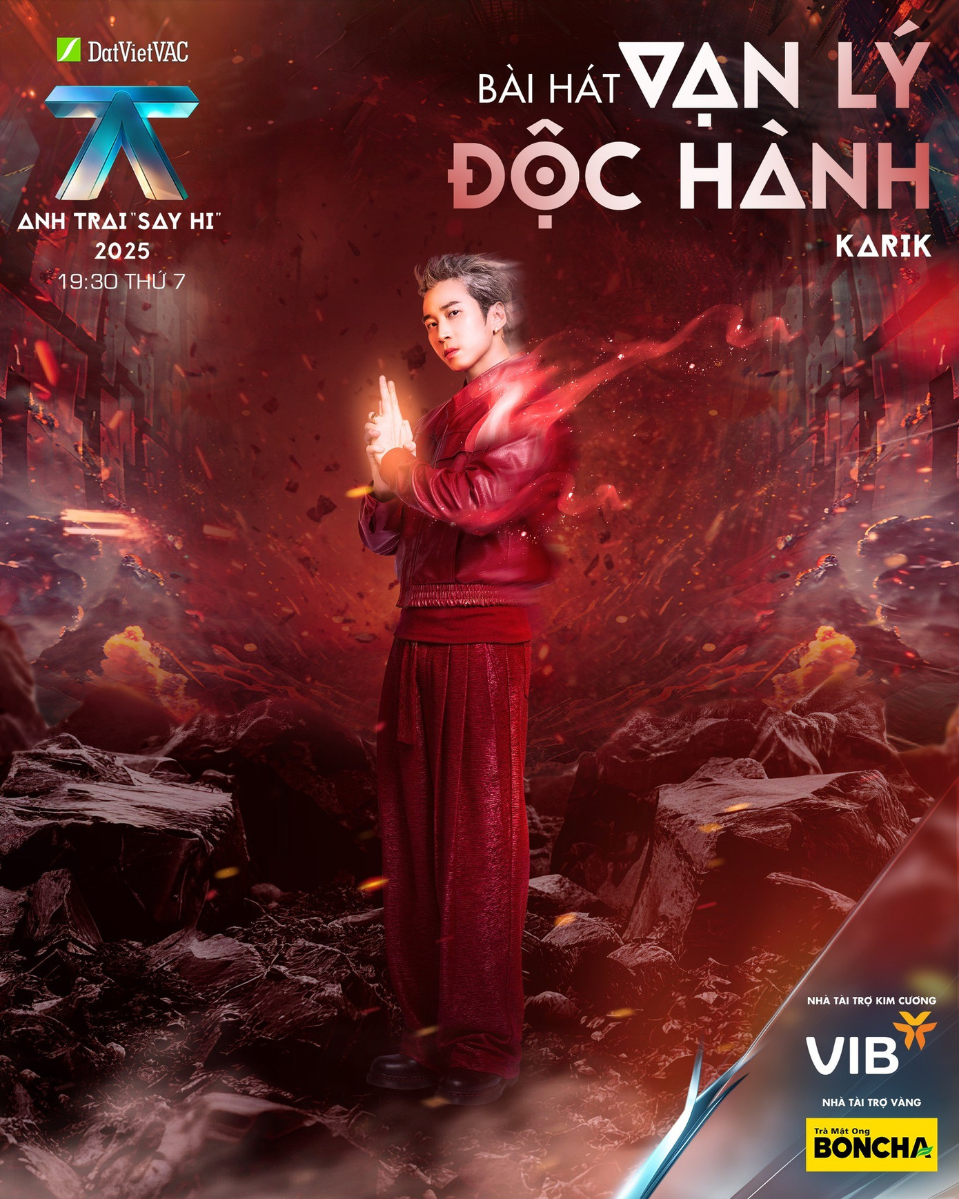Karik tạo ra hiệu ứng thị giác cực mạnh với nguyên cây đỏ. Trang phục được xử lý chất liệu thông minh, tiết chế phụ kiện khiến diện mạo của "anh lớn" trông như một chiến binh cô độc theo đúng tinh thần của ca khúc Vạn Lý Độc Hành.