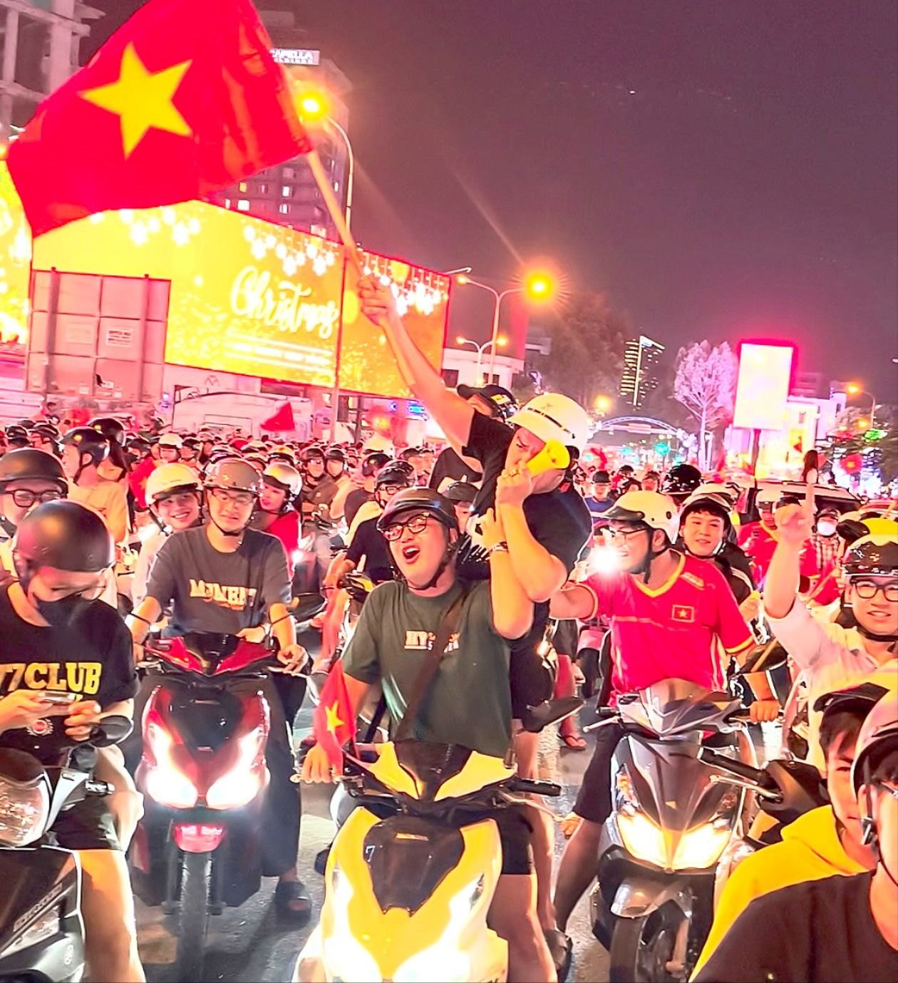 Người hâm mộ bày tỏ niềm vui trên đường Trần Hưng Đạo, phường Bến Thành, TPHCM. Ảnh: HOÀNG HÙNG