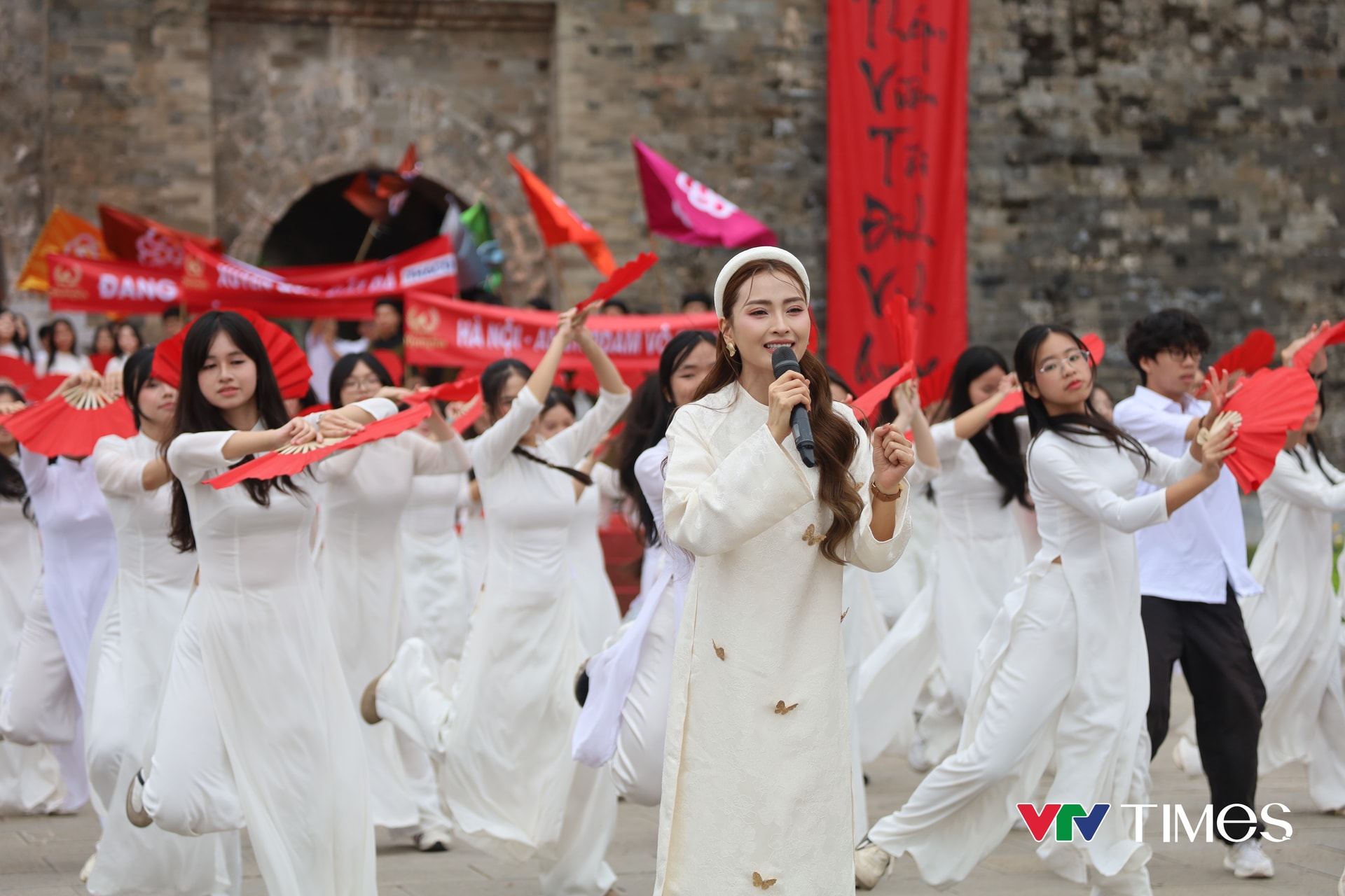 MC Huyền Trang (áo dài trắng) mang không khí náo nhiệt đến với buổi tổng duyệt.