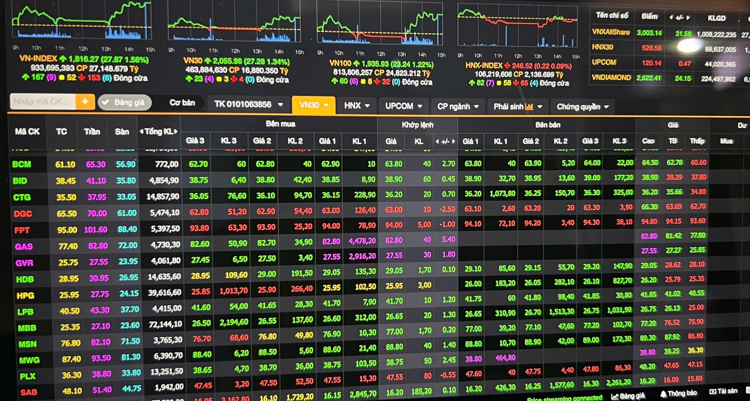 Đáng chú ý, rổ VN30 đóng vai trò là đầu tàu dẫn dắt khi tăng 27,28 điểm với 23 mã tăng giá. Thanh khoản thị trường duy trì ở mức cao với giá trị giao dịch đạt hơn 27.100 tỷ đồng. Khối lượng giao dịch lớn cho thấy tâm lý nhà đầu tư đã rũ bỏ sự thận trọng, thay vào đó là sự kỳ vọng lớn vào chu kỳ tăng trưởng mới thay vì chỉ là một đợt phục hồi kỹ thuật đơn thuần.