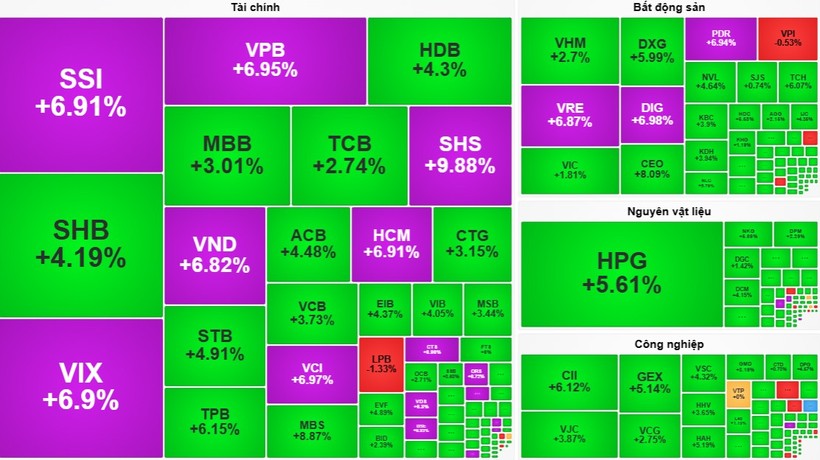 SHS dẫn đầu với mức tăng +9,88%, tiếp theo là MBS (+8,87%), VND (+6,82%), VCI (+6,97%), VIX (+6,9%), SSI (+6,91%) và HCM (+6,91%). Thanh khoản toàn nhóm tăng vọt, chiếm tỷ trọng lớn trong tổng giao dịch toàn sàn và góp phần kéo VN-Index vượt ngưỡng kháng cự quan trọng.