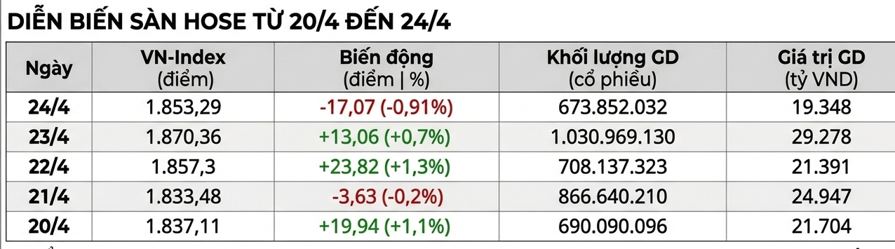 Trong phiên giao dịch cuối tuần, cụ thể ngày 24/4, áp lực bán xuất hiện ngay từ đầu phiên sáng khiến thị trường nghiêng về sắc đỏ. Thanh khoản suy yếu rõ rệt cùng với hoạt động bán ròng gia tăng từ khối ngoại đã tạo thêm sức ép lên chỉ số.