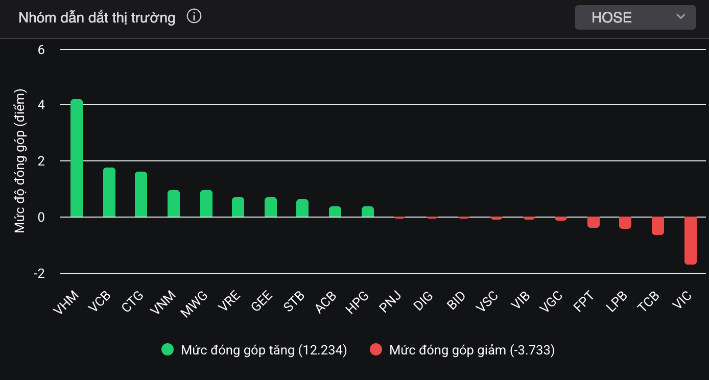 Nhóm dẫn dắt thị trường ghi nhận “đầu tàu” VHM. Các mã ngân hàng chiếm áp đảo trong nhóm dẫn đầu, với sắc xanh bao phủ VCB, CTG, STB, ACB… Dù các cổ phiếu không thể bảo toàn thành quả tích cực sau giờ mở cửa, nhưng nhóm ngân hàng vẫn đóng góp lực kéo đáng kể.