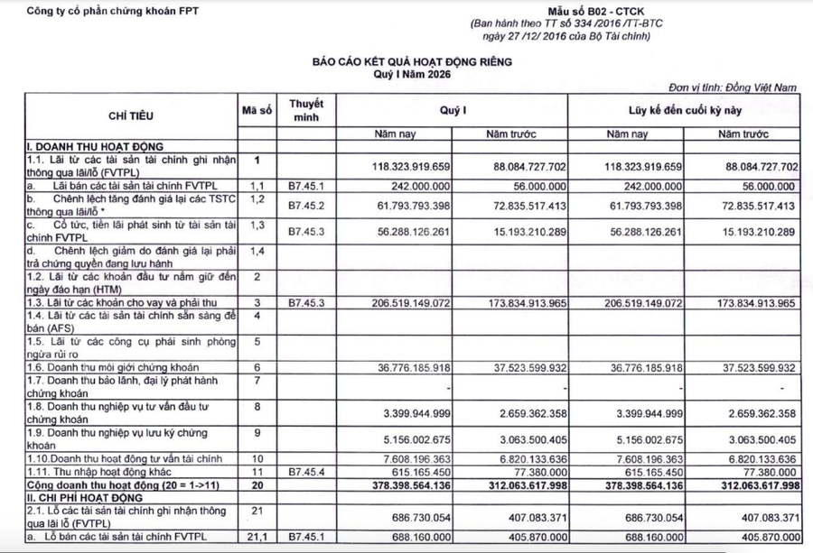 Trong ba tháng đầu năm, doanh thu hoạt động của FPTS đạt khoảng 378,3 tỷ đồng, tăng 21% so với cùng kỳ năm trước. Tuy nhiên, tổng chi phí tăng tới 40%, lên hơn 196,7 tỷ đồng, tăng cao hơn đáng kể so với tốc độ mở rộng doanh thu.