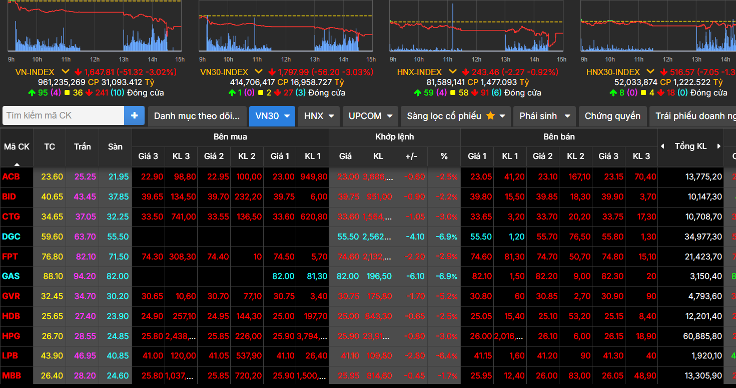 Kết tuần từ ngày 16 đến 20-3, VN-Index giảm 48,43 điểm (-2,86%), dừng tại mức 1.647,81 điểm.