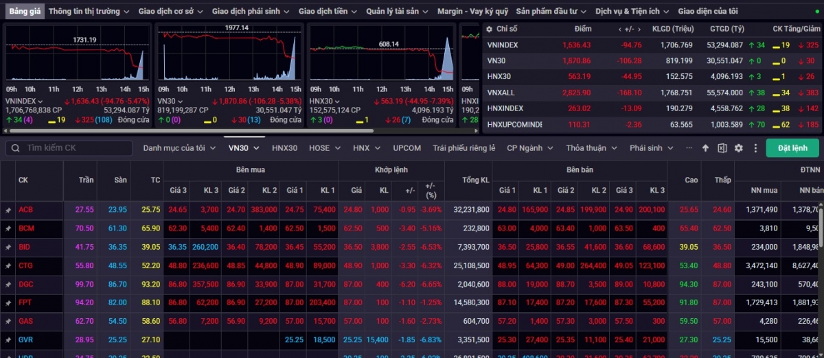 Đóng cửa phiên giao dịch hôm nay 20/10, VN-Index giảm 94,76 điểm (-5,47%), xuống 1.636,43 điểm với 34 mã tăng và 325 mã giảm (108 mã giảm sàn). Tổng khối lượng giao dịch đạt hơn 1,7 tỷ đơn vị, giá trị 53.020 tỷ đồng.