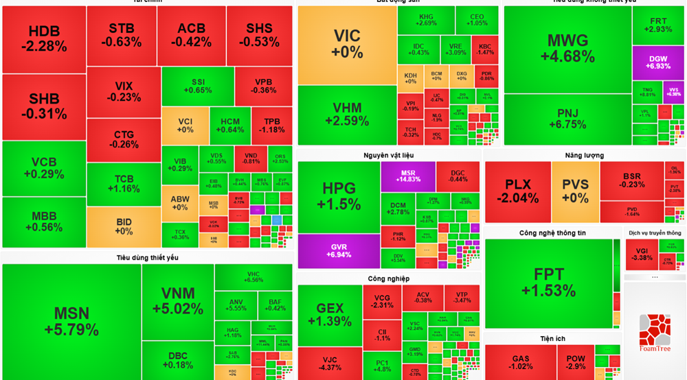 Ở nhóm tiêu dùng thiết yếu, MSN tăng 5,79%, VNM tăng 5,02%, đóng vai trò quan trọng trong việc nâng đỡ chỉ số. Đà tăng mạnh của các cổ phiếu này phản ánh kỳ vọng tích cực của nhà đầu tư vào triển vọng phục hồi sức mua trong nước, cũng như kết quả kinh doanh được dự báo khả quan hơn trong thời gian tới.