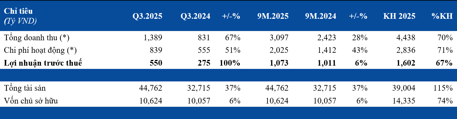 Giá trị giao dịch bình quân toàn thị trường quý III/2025 tăng 135%, đạt gần 44.000 tỷ đồng/ngày. Trong bối cảnh đó, doanh thu quý III của HSC đạt 1.389 tỷ đồng, tăng 67% so với cùng kỳ.