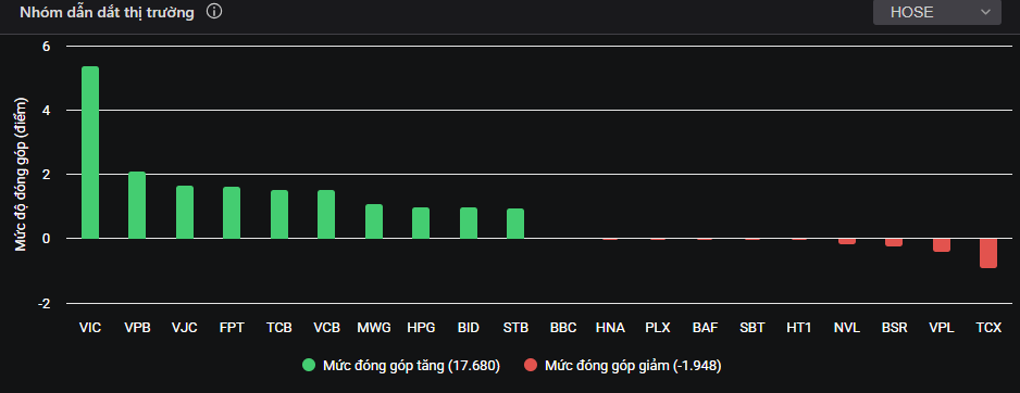 Thị trường chứng khoán tương đối tiêu cực trong phiên sáng, thậm chí qua giờ nghỉ trưa, cao trào được đẩy lên khi cổ phiếu nhóm Vingroup VIC, VHM và VRE đồng loạt giảm sàn, VPl cũng giảm mạnh. Bốn cổ phiếu này khiến VN-Index mất gần 20 điểm, tuy nhiên, sự tiêu cực không gây ảnh hưởng lan tỏa mạnh trên thị trường. Ở thời điểm tiêu cực nhất, VN-Index mất hơn 23 điểm, trong đó gần 20 điểm do nhóm Vingroup.