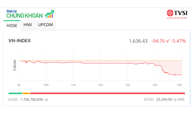 Đóng cửa, sàn HOSE có 34 mã tăng và 325 mã giảm (108 mã giảm sàn), VN-Index giảm 94,76 điểm (-5,47%), xuống 1.636,43 điểm. Tổng khối lượng giao dịch đạt hơn 1,7 tỷ đơn vị, giá trị 53.020 tỷ đồng, tăng 33,9% về khối lượng và 26% về giá trị so với phiên cuối tuần trước. Giao dịch thỏa thuận đóng góp gần 71,2 triệu đơn vị, giá trị 2.731,5 tỷ đồng.