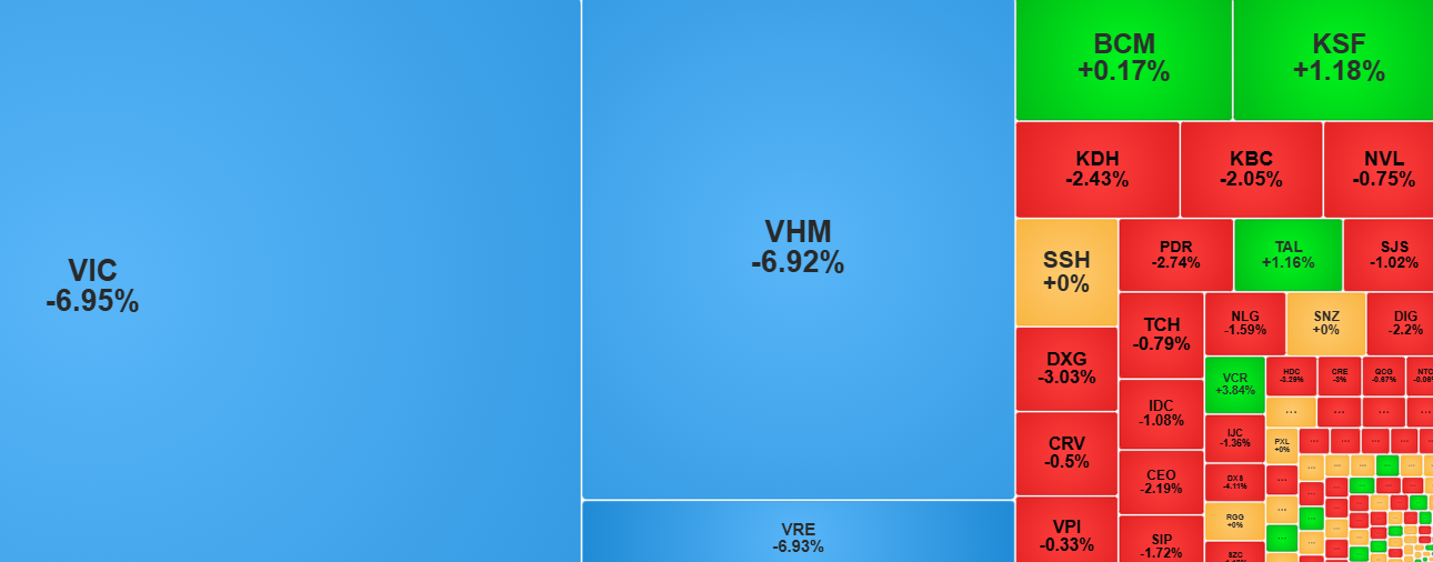 Nếu như những phiên vừa qua, cổ phiếu nhà Vingroup nâng đỡ mạnh thị trường thì phiên này ngược lại. Bộ ba VIC, VHM, VRE đồng loạt giảm sàn đã lấy đi lần lượt 18,9 điểm, 7,23 điểm, 1,13 điểm từ chỉ số VN-Index. Ngoài ra, VPL cũng lấy đi 1,16 điểm.
