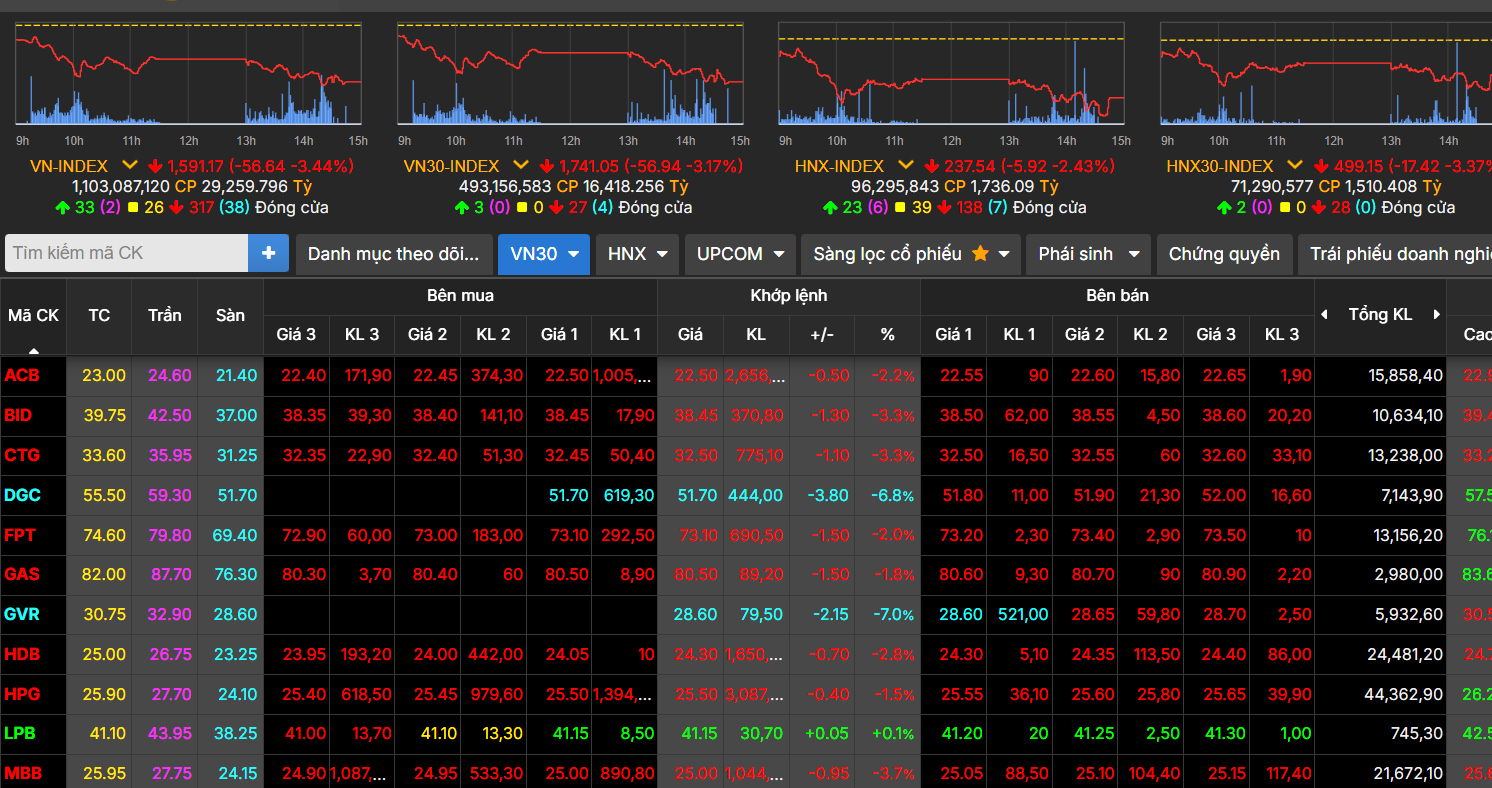 Sang phiên chiều, thị trường diễn biến tiêu cực hơn khi lực bán gia tăng mạnh về cuối phiên. Đóng cửa, VN-Index còn 1.591,17 điểm, giảm 56,64 điểm (-3,44%); VN30-Index xuống 1.741,05 điểm, mất 56,94 điểm (-3,17%).