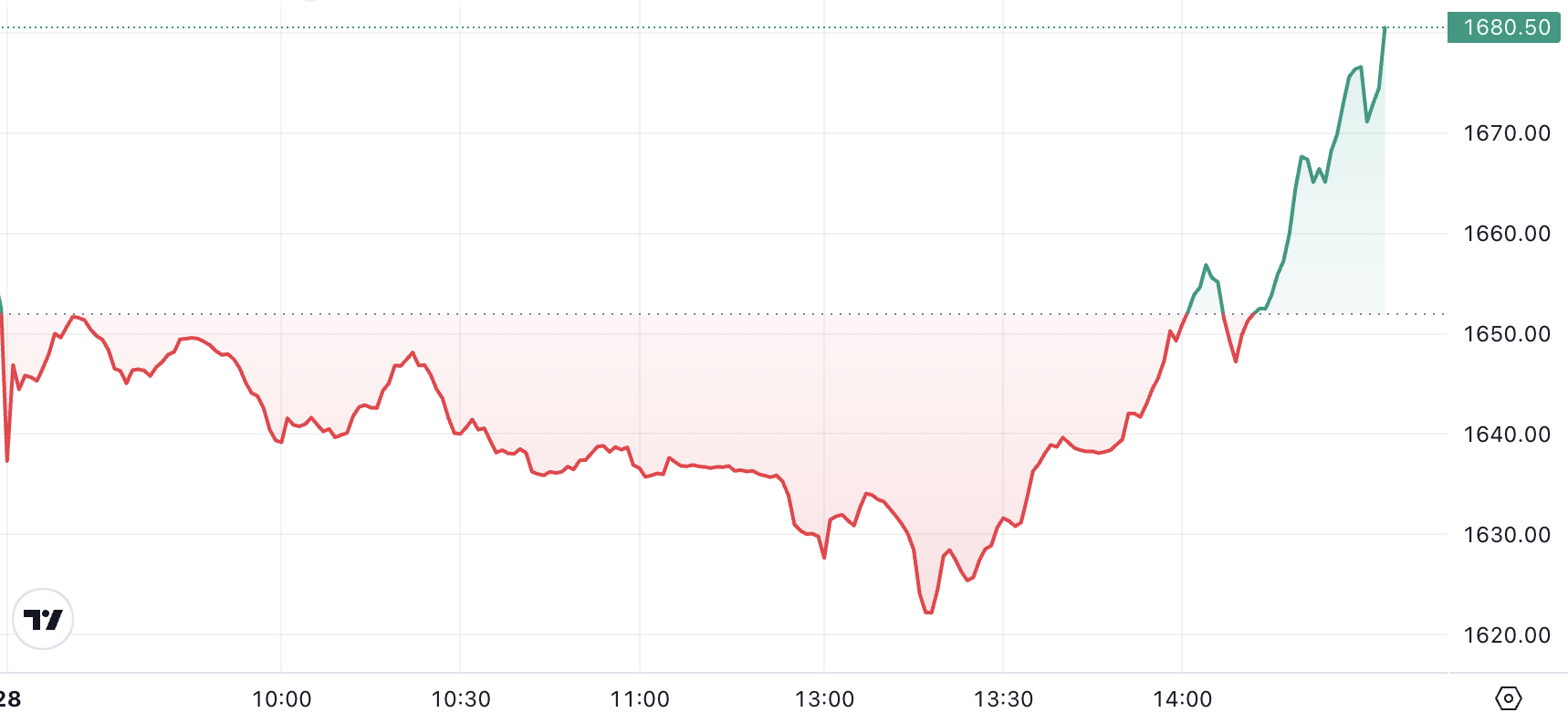 Chốt phiên giao dịch ngày 28/10, VN-Index đóng cửa ở mức 1.680,5 điểm, tăng 27,96 điểm tương ứng +1,69%. Nhưng trên thực tế, chỉ số còn tăng mạnh hơn khi phục hồi một mạch từ mức giá thấp nhất phiên.