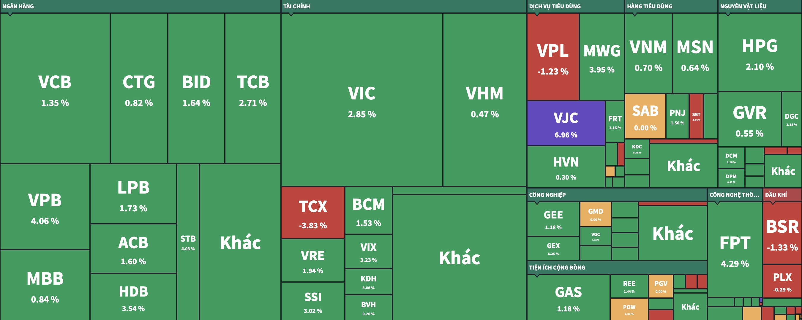 Cùng với nhóm công nghệ và bất động sản, nhóm ngân hàng cũng là điểm sáng dẫn dắt chỉ số hôm nay. Loạt cổ phiếu lớn như VPB, STB, TCB, VIB cũng đột ngột tăng điểm mạnh phiên chiều bất chấp phiên sáng dưới tham chiếu hoặc đi ngang không bứt phá. Loạt cổ phiếu ngân hàng tăng trên 2% hôm nay khá nhiều, ghi nhận VIB - VPB - STB tăng đến trên 4%, HDB tăng 3,54%, TCB - TPB tăng trên 2%. Sức bật này đưa nhóm ngân hàng tăng 1,85% phiên hôm nay.