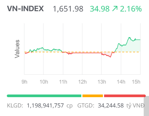 Thị trường chứng khoán Việt Nam vừa trải qua phiên giao dịch khởi sắc. VN-Index có thời điểm "nhúng" xuống mốc 1.600 điểm trước khi dòng tiền bắt đáy ồ ạt chảy vào đẩy chỉ số chính hồi phục mạnh mẽ. Kết thúc phiên giao dịch, VN-Index tăng 34,98 điểm, lên mức 1.651,98 điểm.