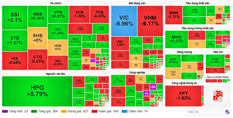 Ở chiều ngược lại, các mã tác động tiêu cực làm giảm 26,13 điểm của VN-Index gồm: VIC, VHM, VCB, BID, GVR, FPT, GAS, VPL, BCM, VJC.