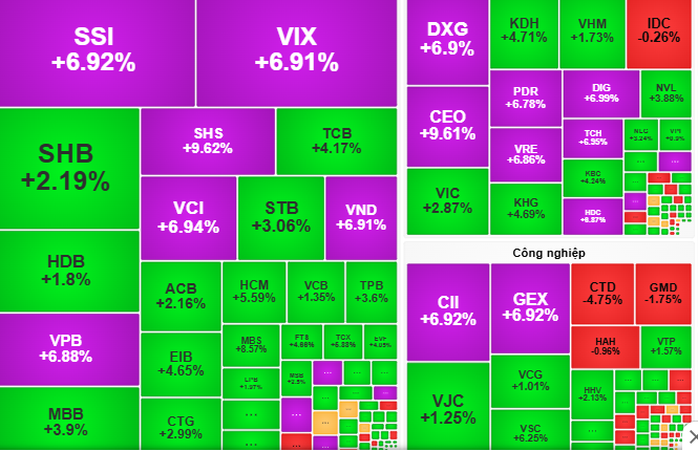 Kết phiên 4-1, nhiều cổ phiếu trên sàn HOSE tăng giá kịch trần 7% ( các mã cổ phiếu màu tím)