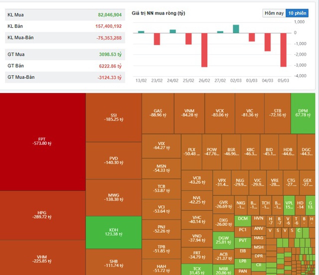 Khối ngoại bán ròng cực mạnh trên VN-Index phiên 5/3.