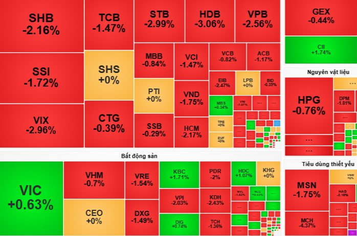 Bước sang phiên chiều, lực cầu bất ngờ trở lại ở nhóm ngân hàng và hệ sinh thái Vingroup giúp chỉ số thu hẹp đáng kể mức giảm, thậm chí có lúc lật ngược sang sắc xanh. Dẫu vậy, áp lực cung gia tăng về cuối phiên, đặc biệt ở nhóm cổ phiếu ngân hàng, chứng khoán, đã kéo VN-Index đóng cửa ở 1.642 điểm, giảm 12 điểm (-0,74%).