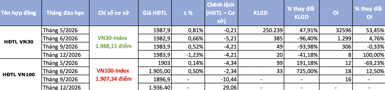 Trên thị trường chứng khoán phái sinh, tâm lý cũng có phần thận trọng hơn khi chỉ số cơ sở tiến sát vùng kháng cự mạnh 2.000 điểm. Hợp đồng tương lai VN30 đáo hạn tháng 5/2026 tiếp tục duy trì chênh lệch âm nhẹ so với VN30-Index. Đây cũng là kỳ hạn gần nhất và đang tập trung dòng tiền tham gia giao dịch lớn nhất.
