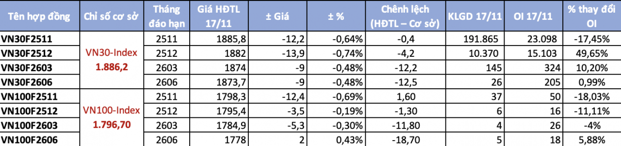 Về điểm số, đa số các hợp đồng tương lai đều đóng cửa trong sắc đỏ, chung xu hướng với thị trường cơ sở. Hợp đồng tương lai VN30 kỳ hạn gần nhất, cũng là hợp đồng sẽ đáo hạn ngay phiên kế tiếp, kết phiên giảm 12,2 điểm (-0,64%) về 1.885,8 điểm. Chênh lệch âm thu hẹp nhẹ nhờ vẫn giảm chậm hơn VN30-Index. Các hợp đồng kỳ hạn xa hơn như VN30F2512, 41I1G3000, 41I1G6000 tiếp tục ghi nhận basis âm rộng từ -4,2 đến -12,5 điểm.