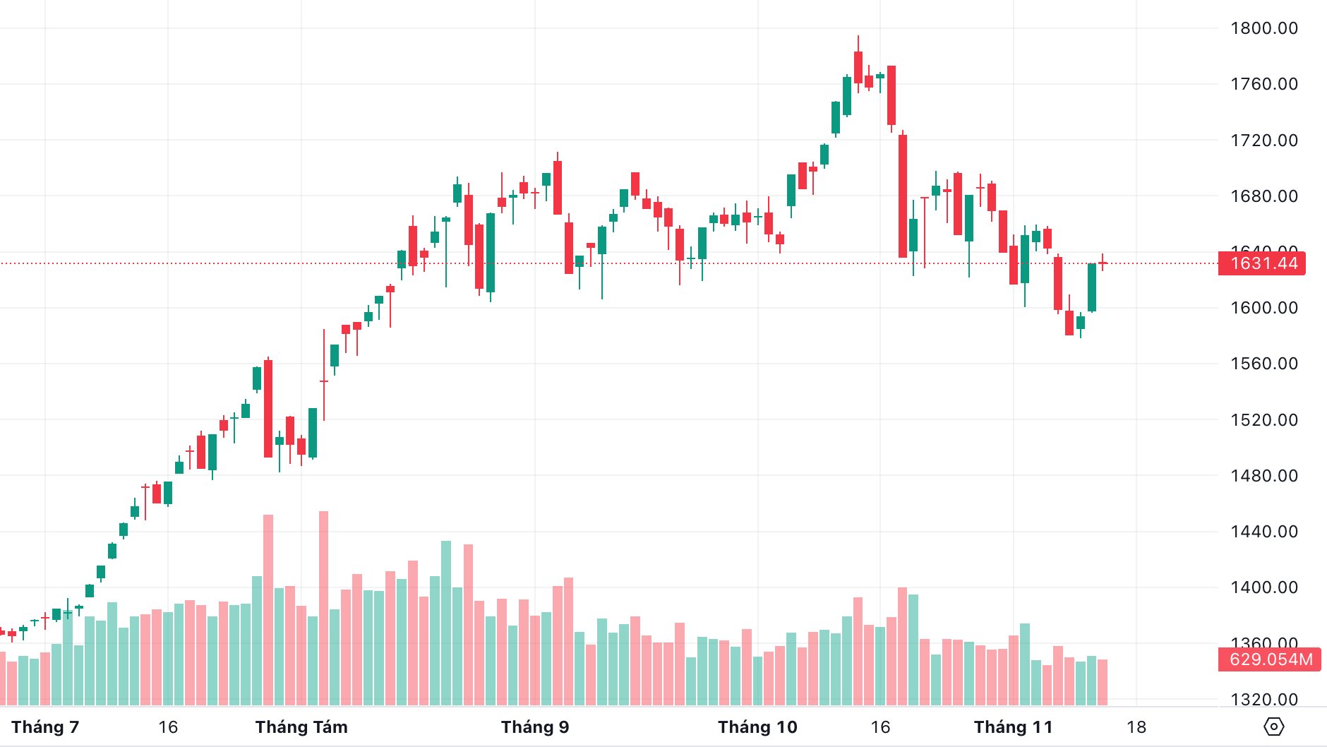 Thanh khoản chưa tăng và một phần chịu áp lực chốt lời sau phiên tăng trước đó khiến chỉ số giằng co mạnh quanh ngưỡng tham chiếu. Kết phiên giao dịch hôm nay (13/11), VN-Index đóng cửa ở 1.631,44 điểm, giảm nhẹ 0,42 điểm tương đương -0,03%.