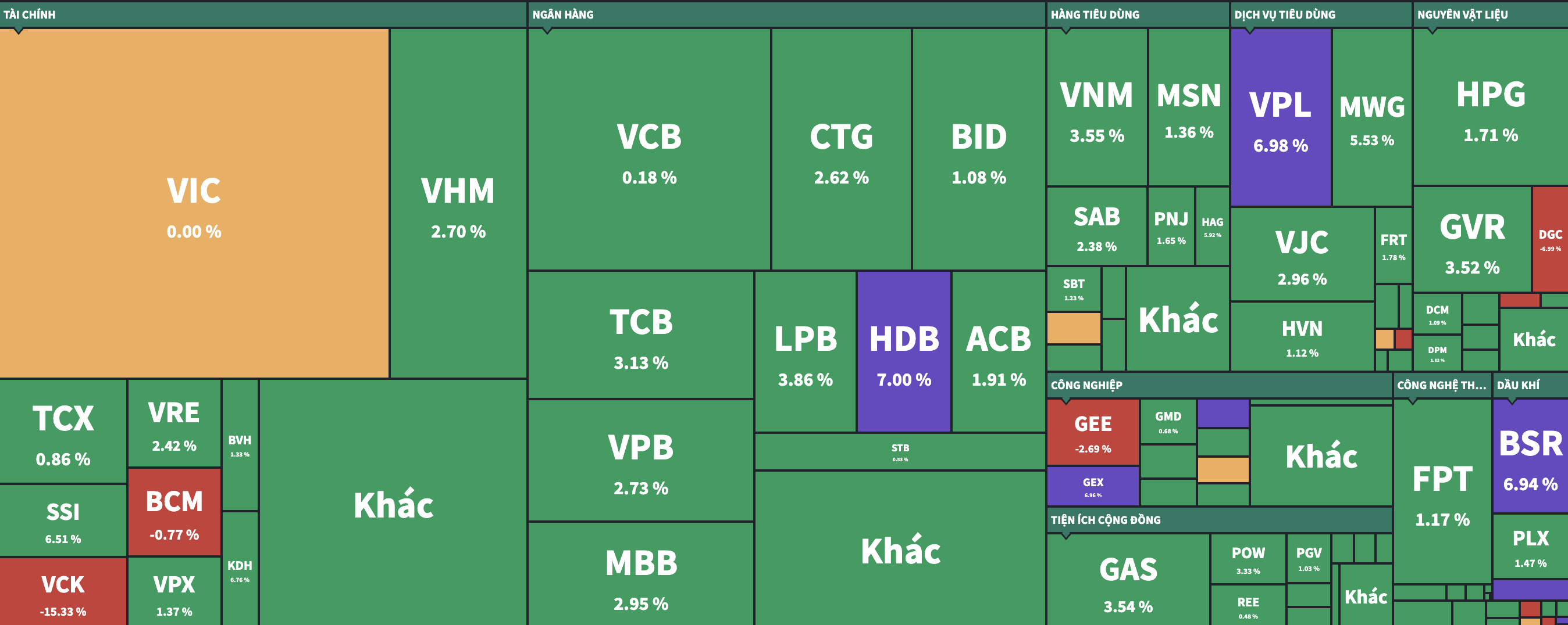 Ngoài ra, còn nhiều nhóm tăng điểm tích cực khác như Dầu khí, Bán lẻ, Ngân hàng, Du lịch giải trí… Nhìn chung, không có ngành nào giảm điểm trong phiên tăng trên 2% này.
