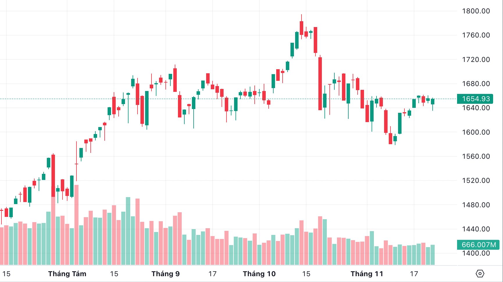 Chỉ số đã dần tăng và thậm chí đã vượt qua được tham chiếu để nhuốm xanh, lên cao nhất 1.656,84 điểm. Nhưng sắc xanh này chỉ hiện diện tạm thời và nhanh chóng quay về giá đỏ. Dù vậy, điểm tích cực là cuối phiên, chỉ số dù giảm nhưng biên độ không quá lớn.