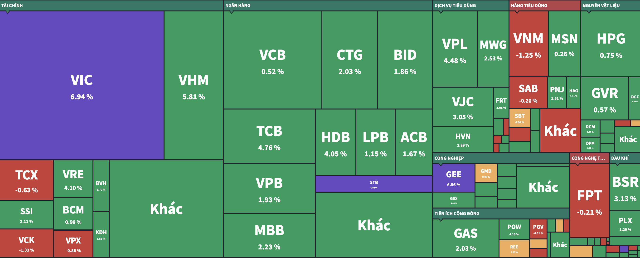 Ở nhóm bất động sản, cổ phiếu nhà Vingroup dẫn đầu. VIC đã tăng tốt từ đầu ngành và chuyển sang sắc tím trong phiên chiều, trở thành mã kéo chỉ số mạnh nhất và góp hơn 17 điểm cho VN-Index. Đồng thuận cùng mã cổ phiếu này, nhóm cùng hệ sinh thái là VPL, VHM và VRE cũng có nến xanh dài hôm nay với mức tăng lần lượt là 4,48% - 5,81% - 4,1%.