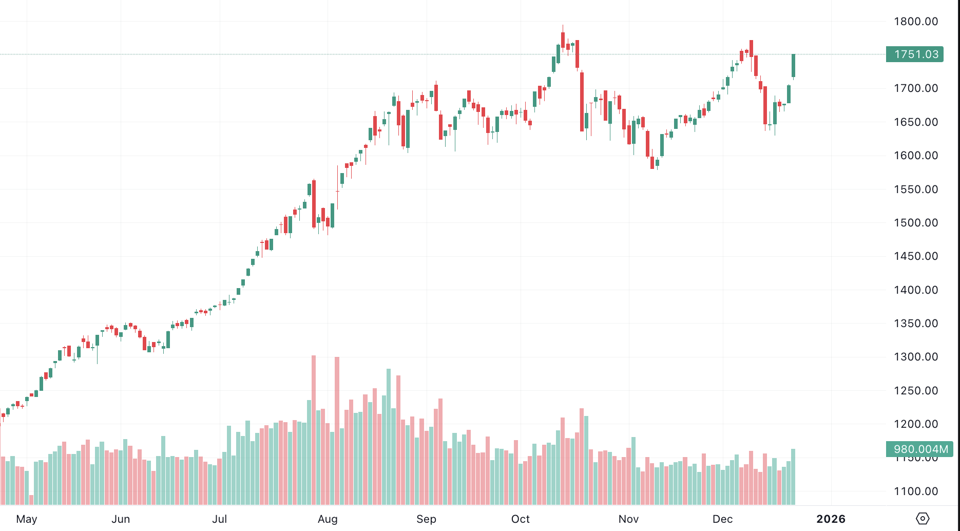 Phiên giao dịch đầu tuần, thị trường có một phiên tăng tích cực hơn 46,7 điểm, đưa chỉ số VN-Index chốt phiên giao dịch ở mức 1.751,03 điểm, tương ứng tăng 2,74%, nối tiếp phiên tăng hơn 27 điểm cuối tuần trước.