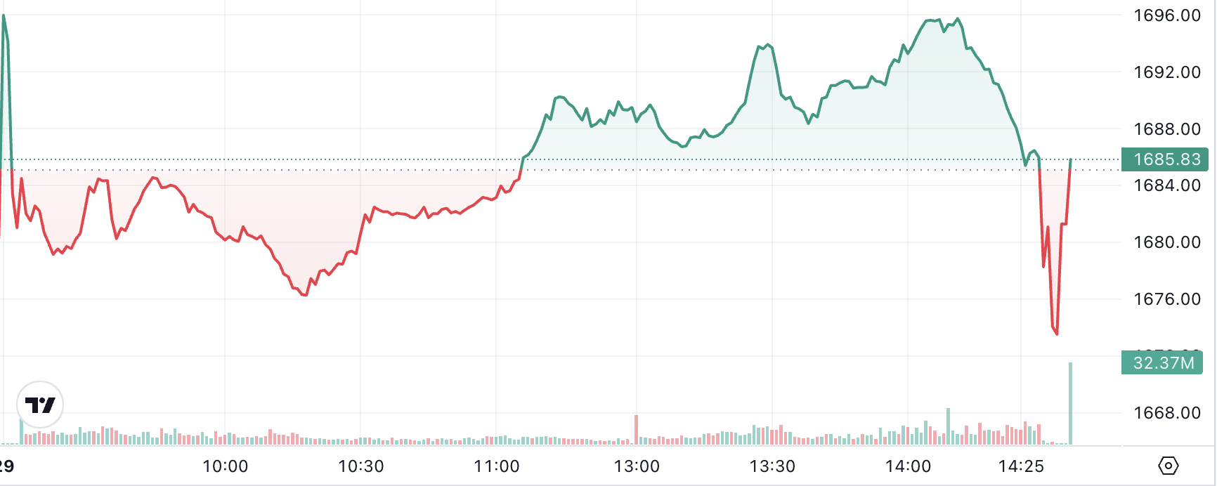 Còn với chỉ số chung, kết thúc phiên, VN-Index lại tăng được 5,33 điểm, tức tăng 0,32%, đóng cửa ngày ở 1.685,83 điểm. Mức tăng mạnh hơn hẳn VN30 cho thấy đà tăng hôm nay được ủng hộ từ nhóm các cổ phiếu vừa và nhỏ, dòng tiền đã lan tỏa đến các cổ phiếu khác trên thị trường thay vì bị ảnh hưởng bởi nhóm Blue-chips.